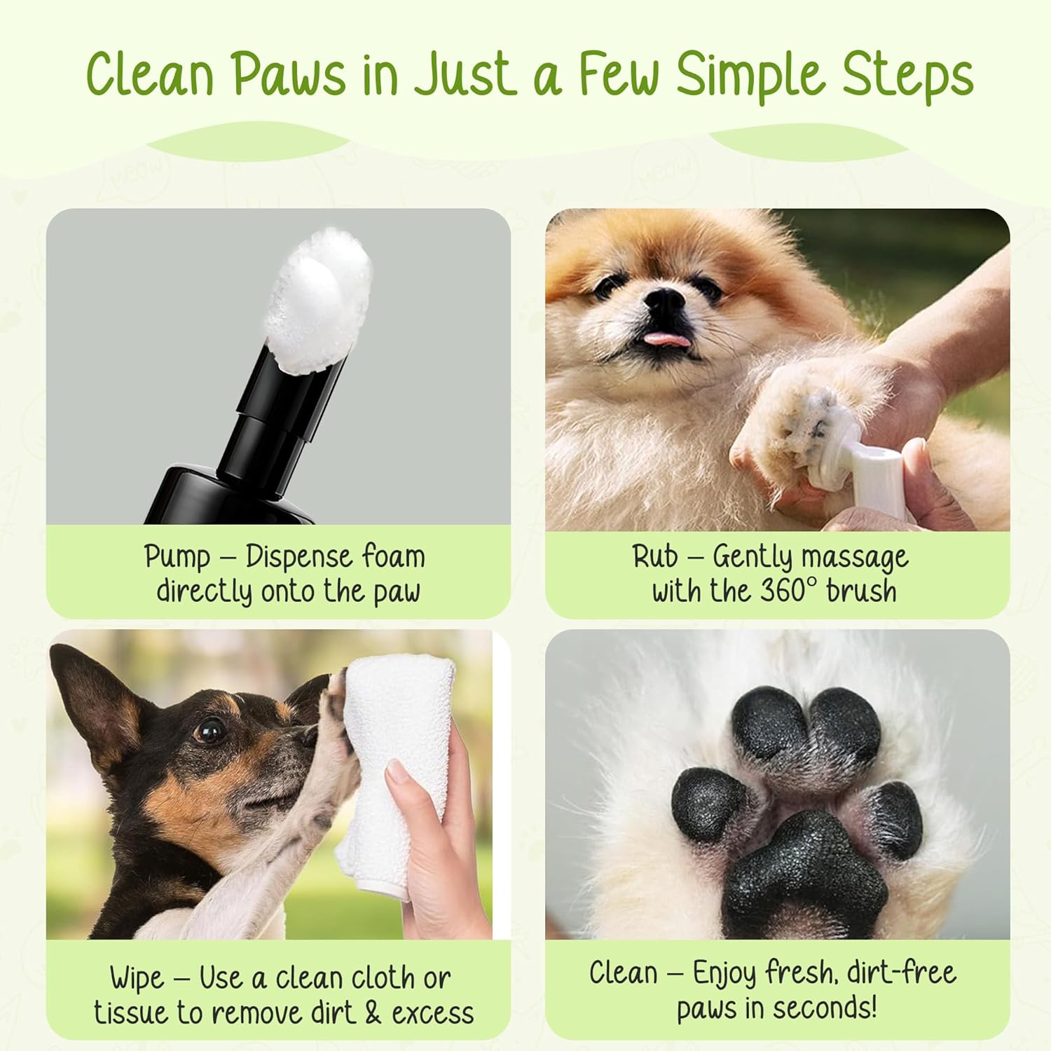 Infused with soothing Aloe Vera and Neem, our gentle, allergen-free formula moisturizes and freshens paws, while also offering natural antibacterial benefits. The included silicone brush provides a soft, deep clean, easily reaching between paw pads to remove dirt and debris.